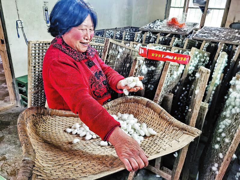 記者來到蠶桑養(yǎng)殖戶雷雪惠家,她正在整理已經采收好的蠶繭。“我今年60多歲,養(yǎng)蠶20多個年頭了,是我們村第一批養(yǎng)蠶戶。通過養(yǎng)蠶,我們家養(yǎng)大了3個孩子,現在2個女兒都已經嫁人,兒子常年在外。我們老兩口和留守在村子里的其他人一樣,靠著桑樹養(yǎng)蠶,一年收入近2萬元,夠我們生活,還有些結余。”雷雪惠笑著說。