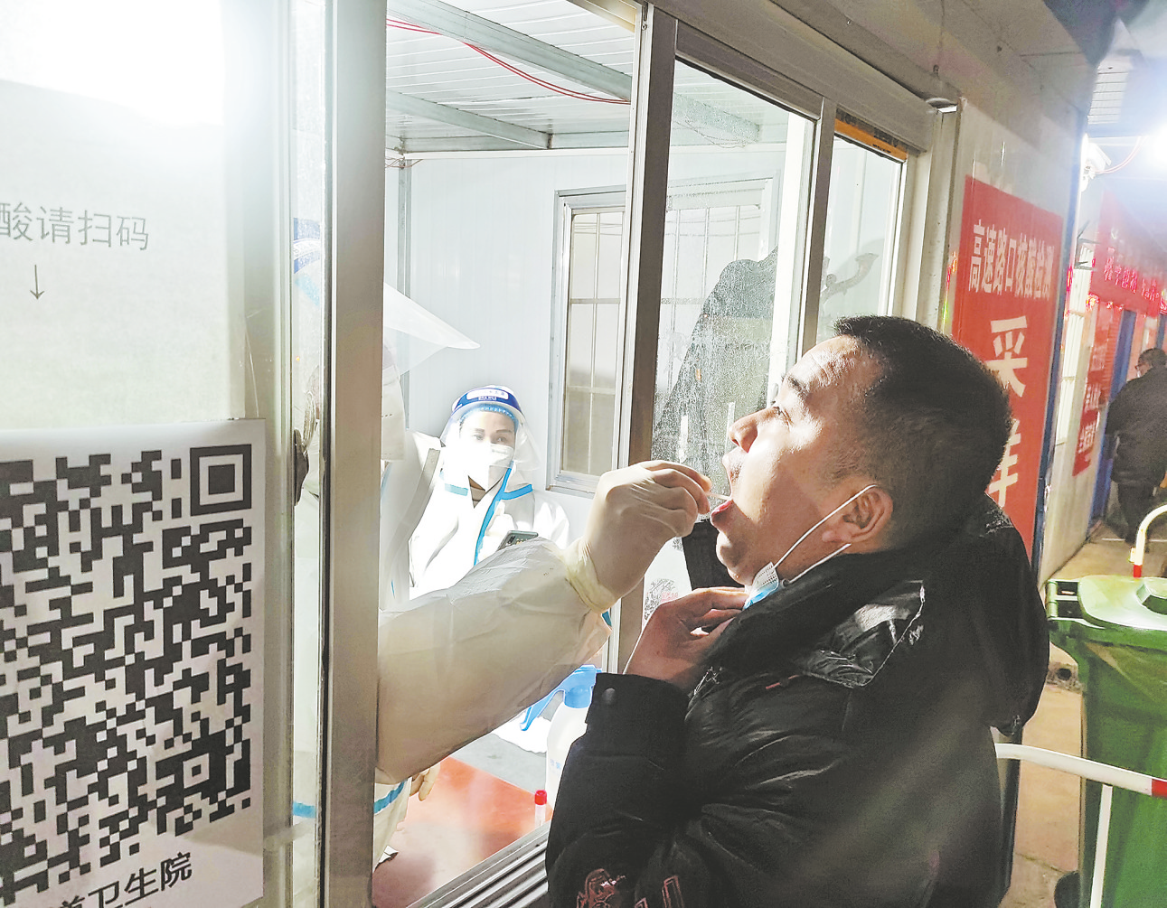 在華陽收費站檢查點,路邊一排藍色帳篷,分別設(shè)置了檢查區(qū)、采樣區(qū)、咨詢區(qū)、等候區(qū)、辦公區(qū)5個區(qū)域,工作人員根據(jù)現(xiàn)場情況將司乘人員引導(dǎo)到相關(guān)區(qū)域。