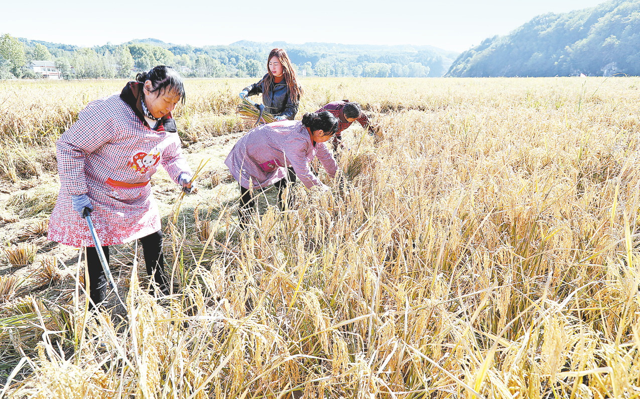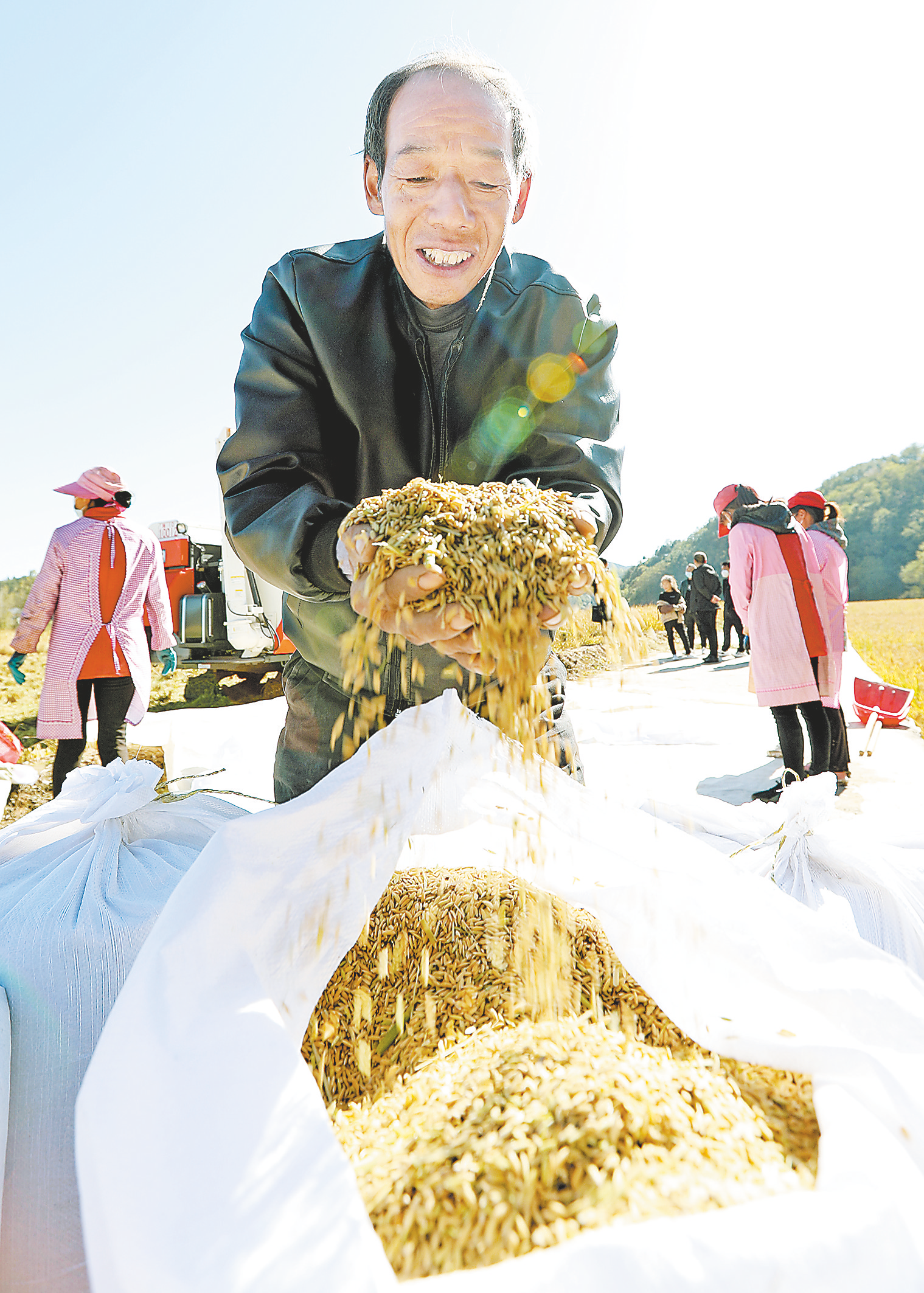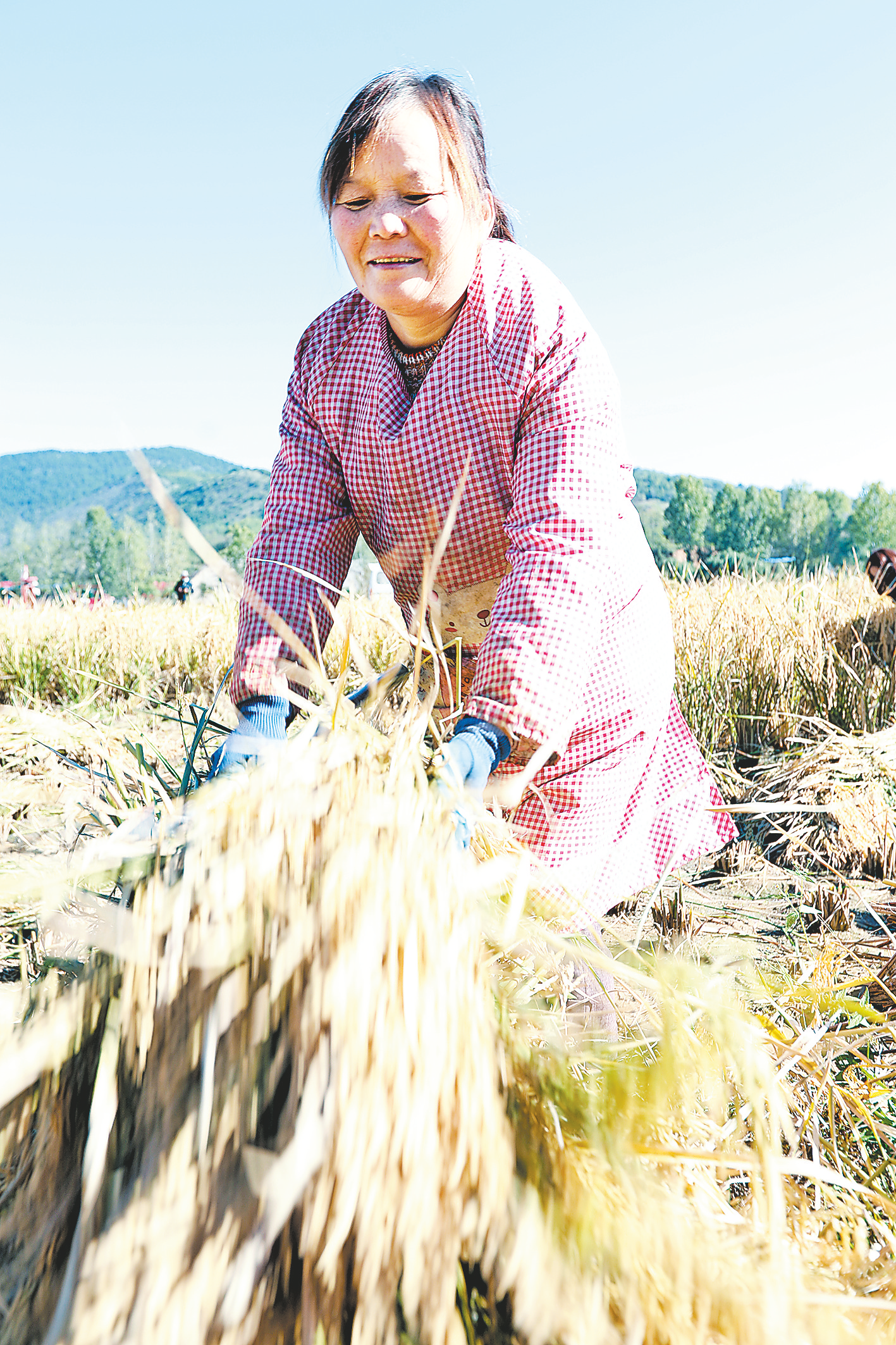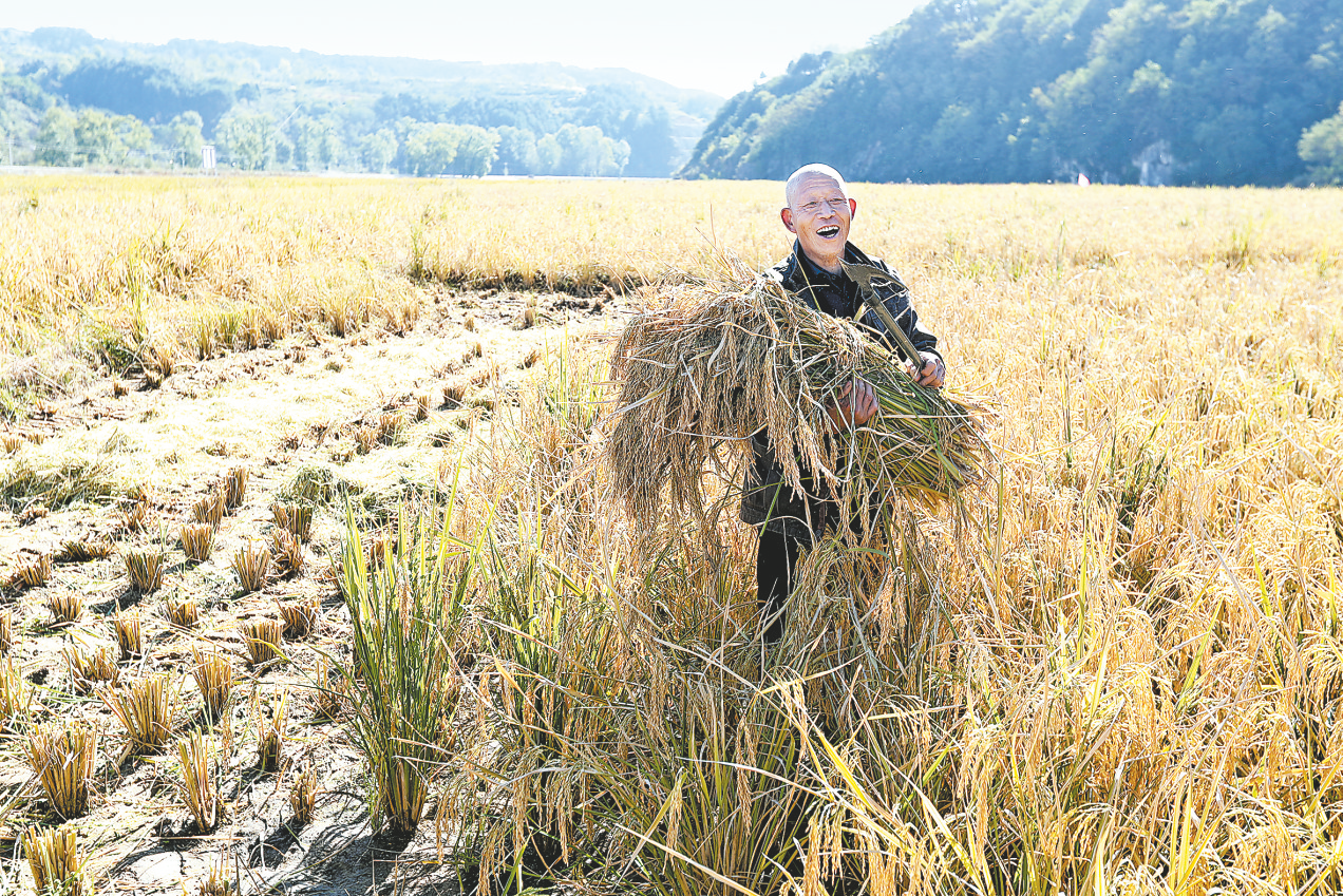 10月11日,洛南縣旱改水水稻種植示范園水稻豐收在望,村民們歡聲笑語(yǔ),鳴放鞭炮,舉行慶豐收儀式。