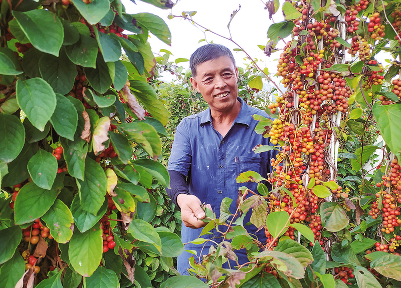 8月19日,雖已立秋,但仍然酷熱逼人,身處密不透風(fēng)的五味子藤蔓間的張喜盈,不一會(huì)就滿頭大汗。每天進(jìn)地察看五味子的生長(zhǎng)情況,是張喜盈的多年來的習(xí)慣。“搞農(nóng)業(yè)就是操心大,哪一塊地太干需要澆水了,哪一片苗子長(zhǎng)得不好了該施肥了,就跟經(jīng)管娃娃一樣,馬虎不得。”張喜盈一張瘦削的臉,因長(zhǎng)年在戶外勞作而曬得黝黑,笑起來更顯憨厚和樸實(shí)。