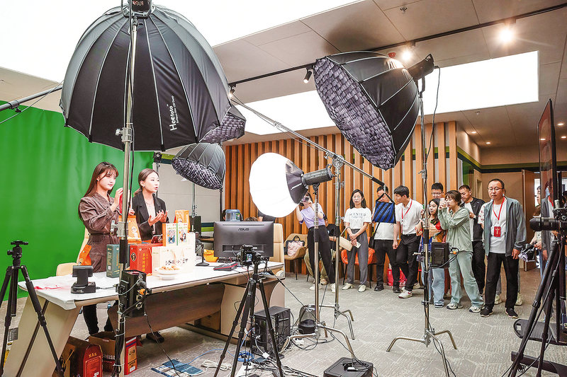 網(wǎng)絡(luò)達(dá)人在西北核桃物流園內(nèi)的洛味緣電商直播基地售賣洛南農(nóng)特產(chǎn)品
