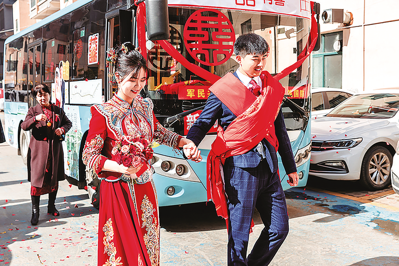 巴圖莉的新式婚禮,在洛南并非個例。洛南縣城關(guān)街道居民田添說,今年3月11日是自己和新郎張園濤結(jié)婚的好日子,但他們沒有乘坐轎車,而是選擇了乘坐公交車。“與豪華車隊相比,公交車更有性價比,氛圍感更好。”新娘田添說。