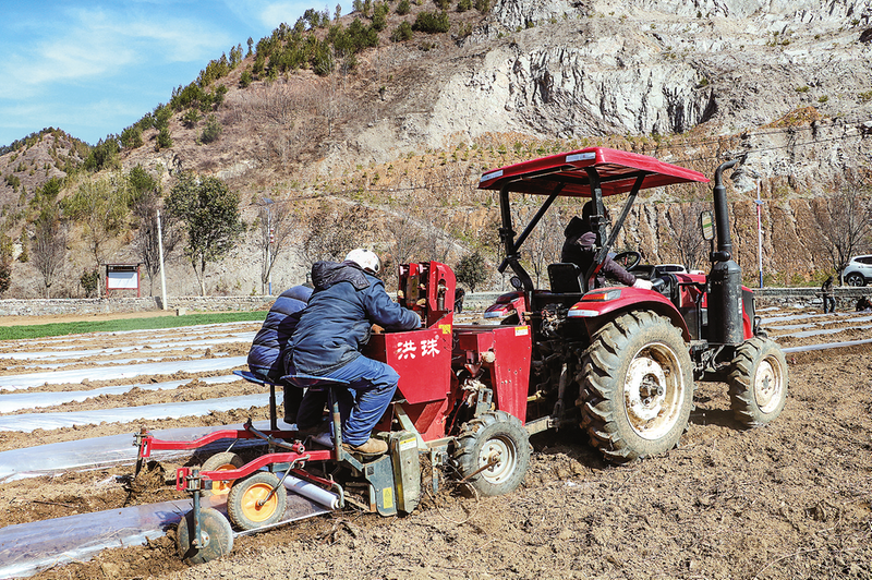 筆者走進四皓街道連河村,只見農機人員駕駛播種機在地塊平整、規(guī)模較大的田間來回穿梭,進行播種、覆膜;村民三五成群在規(guī)模較小的地塊進行整地起壟、開溝、播種、施肥、覆膜……各項工序有條不紊,不一會兒,一行行覆蓋好薄膜、排列整齊的田壟就呈現在眼前。