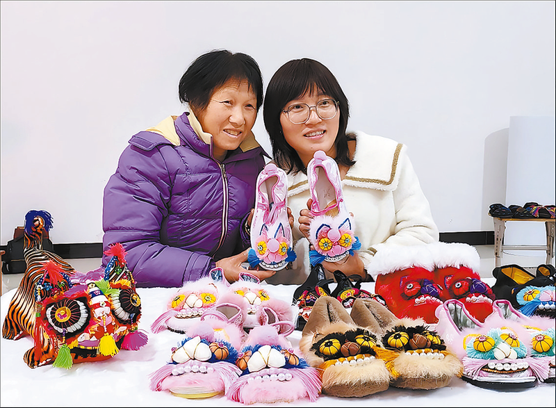 尚靜(右)和母親一起展示虎頭鞋
