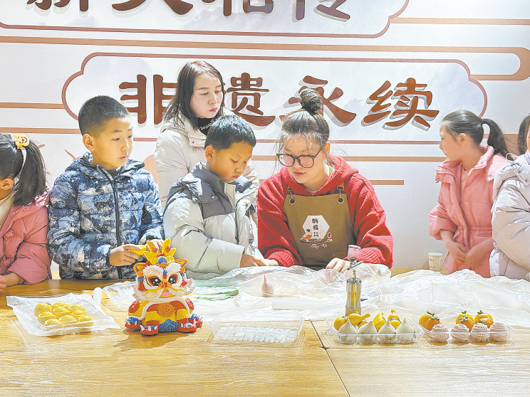 2月10日,楊潔在洛南縣文化館教小朋友們做花饃。