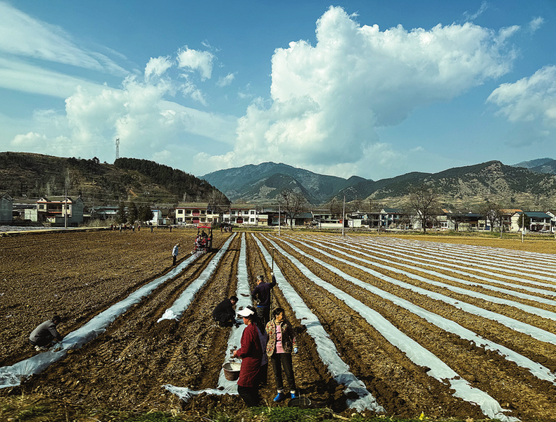 在洛南縣保安鎮(zhèn)許廟村,群眾搶抓農(nóng)時鋪設(shè)地膜,田間一派繁 忙景象。