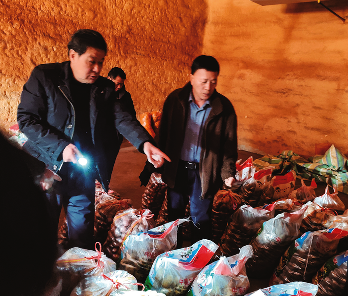 張建設(shè)(左)在倉(cāng)庫(kù)查看馬鈴薯種薯儲(chǔ)備情況。