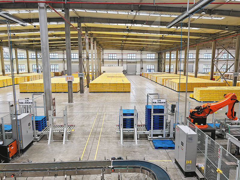 洛國(guó)蜂蜜水產(chǎn)業(yè)園建設(shè)項(xiàng)目倉儲(chǔ)車間內(nèi),一垛垛成品蜂蜜水整齊擺放在合格區(qū)位。