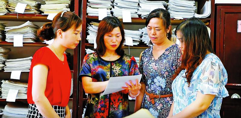 李曉燕(左二)為同事指導(dǎo)檔案管理工作