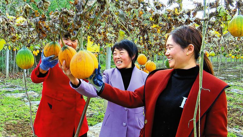 在趙川鎮(zhèn)店坊河村的千畝瓜蔞基地里,一排排架子上爬滿了藤蔓,大大小小、金黃色的瓜蔞掛滿枝頭,村民們滿懷喜悅地采摘瓜蔞,收獲一年的勞動(dòng)成果。
