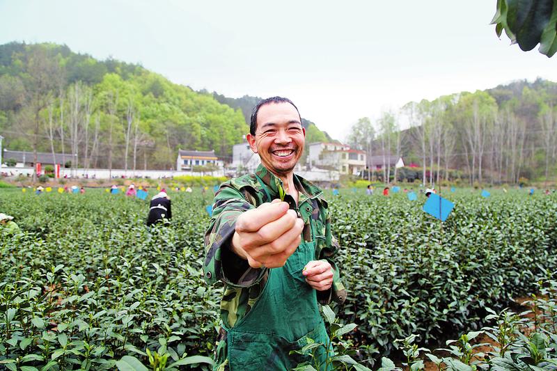 村民向記者展示采摘的明前茶