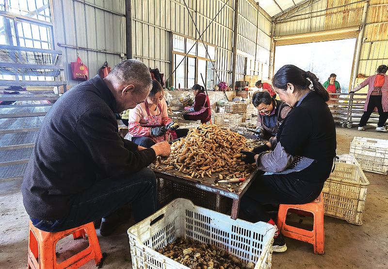 在團坪村股份經(jīng)濟合作社天麻加工廠生產(chǎn)車間,工人們正把采收回來的鮮天麻進行分揀、清洗、蒸煮、切片、烘干,現(xiàn)場十分繁忙。