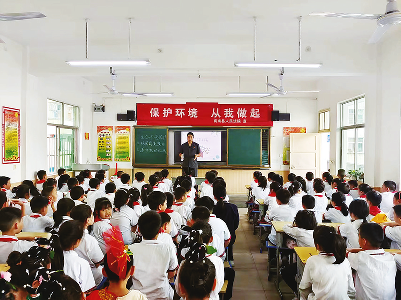 商南縣人民法院充分發(fā)揮宣傳在震懾犯罪和普及法律知識等方面的重要作用,開展各種普法宣傳活動,以普法宣傳、“我為群眾辦實事”和法治進(jìn)校園等活動為抓手,組織干警進(jìn)村鎮(zhèn)、廣場、社區(qū)、企業(yè)、學(xué)校開展環(huán)境資源保護(hù)宣傳活動。及時發(fā)布環(huán)境資源保護(hù)刑事案件典型案例。通過設(shè)立咨詢臺、懸掛橫幅、發(fā)放宣傳冊、以案說法等形式,向群眾宣傳環(huán)境資源保護(hù)的意義。同時,依托新媒體平臺,加強(qiáng)線上相關(guān)知識宣傳,提升群眾對環(huán)境資源保護(hù)工作的知曉率,讓群眾自覺參與到環(huán)境資源保護(hù)行動中來。