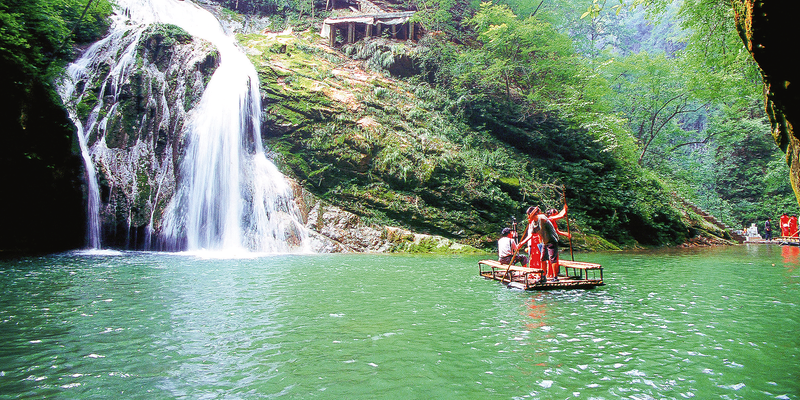 游客在金絲峽景區(qū)鎖龍瀑布下泛舟