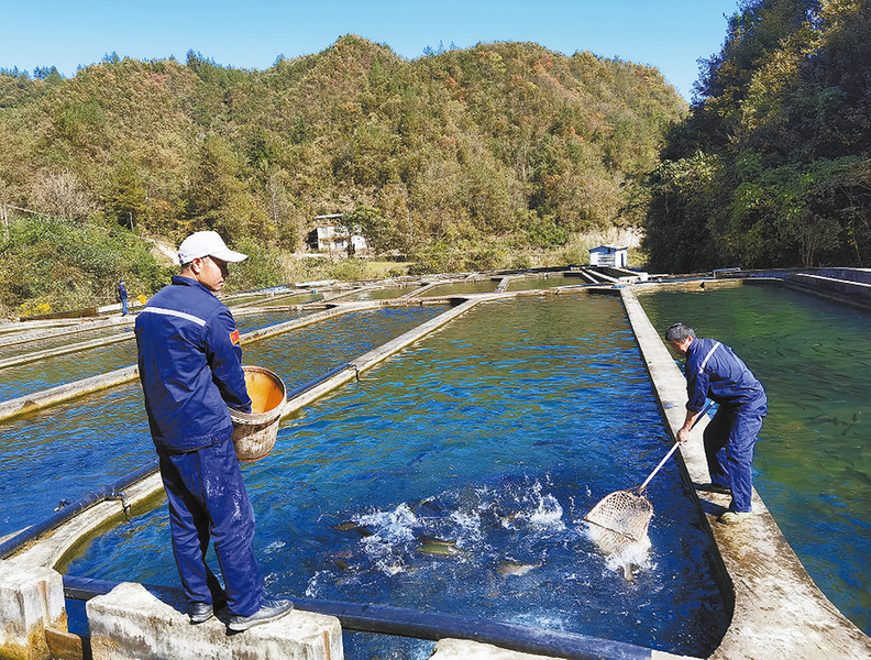 在中棚社區(qū)冷水魚(yú)養(yǎng)殖場(chǎng),一排排整齊的魚(yú)池在陽(yáng)光映照下波光粼粼,成群的魚(yú)兒在池中嬉戲。冷水魚(yú)養(yǎng)殖場(chǎng)主要從事冷水魚(yú)類養(yǎng)殖、種苗繁育、魚(yú)產(chǎn)品加工及垂釣觀光。通過(guò)“龍頭企業(yè)+基地+農(nóng)戶”模式,將當(dāng)?shù)剞r(nóng)戶通過(guò)務(wù)工、運(yùn)輸、土地流轉(zhuǎn)、資金入股、開(kāi)辦全魚(yú)宴、電商銷(xiāo)售等多種渠道融入冷水魚(yú)養(yǎng)殖中,實(shí)現(xiàn)年人均增收2000元。