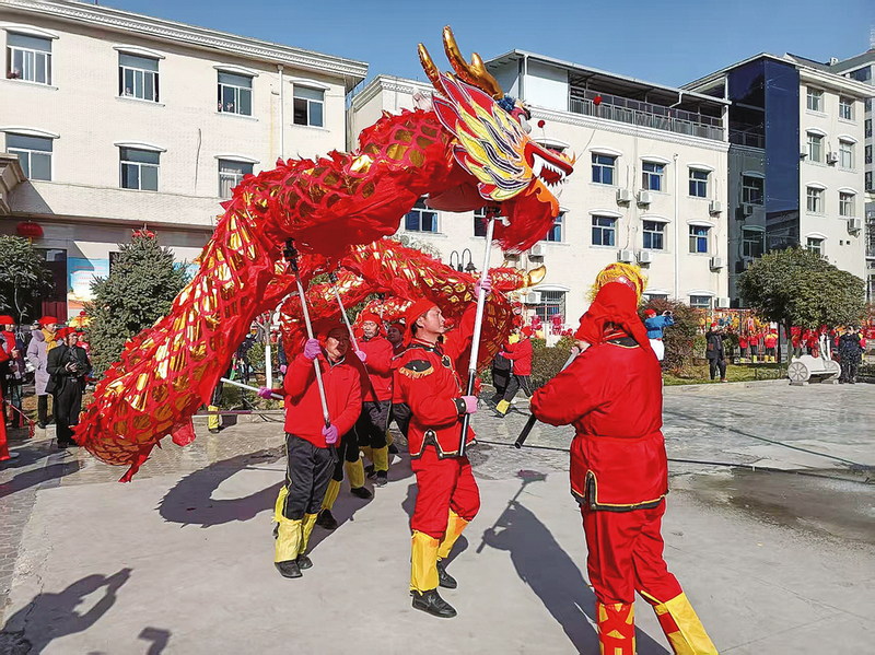 除了舞獅,舞龍也是春節(jié)期間人們喜聞樂見的民俗表演。伴隨著激揚的音樂鼓點,錦色長龍跟著繡球翻騰起舞,忽而翹首仰視,忽而回頭低顧,忽而回首匍匐,忽而搖頭擺尾,千姿百態(tài),妙趣橫生,為今年的新春佳節(jié)增添了濃郁的歡樂氣氛。