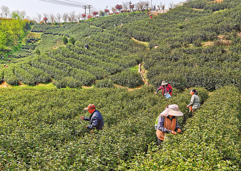 在商南縣富水鎮(zhèn)茶海公園,茶農(nóng)趁著天氣晴好忙著采春茶。(本報(bào)記者 楊 鑫 攝)
