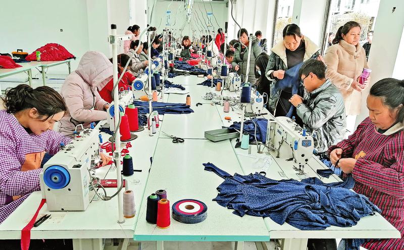 3月23日,山陽(yáng)縣西照川仁和綠園搬遷安置小區(qū)程晨服飾加工廠里,工人們正在加緊趕制工服。為鞏固脫貧攻堅(jiān)成果,當(dāng)?shù)卣衲瓿晒φ猩桃氤坛糠椉庸S進(jìn)駐該小區(qū),可解決就業(yè)35人,帶動(dòng)35戶群眾年戶均增收2萬(wàn)元,預(yù)計(jì)年產(chǎn)值100萬(wàn)元。(張亞男攝)