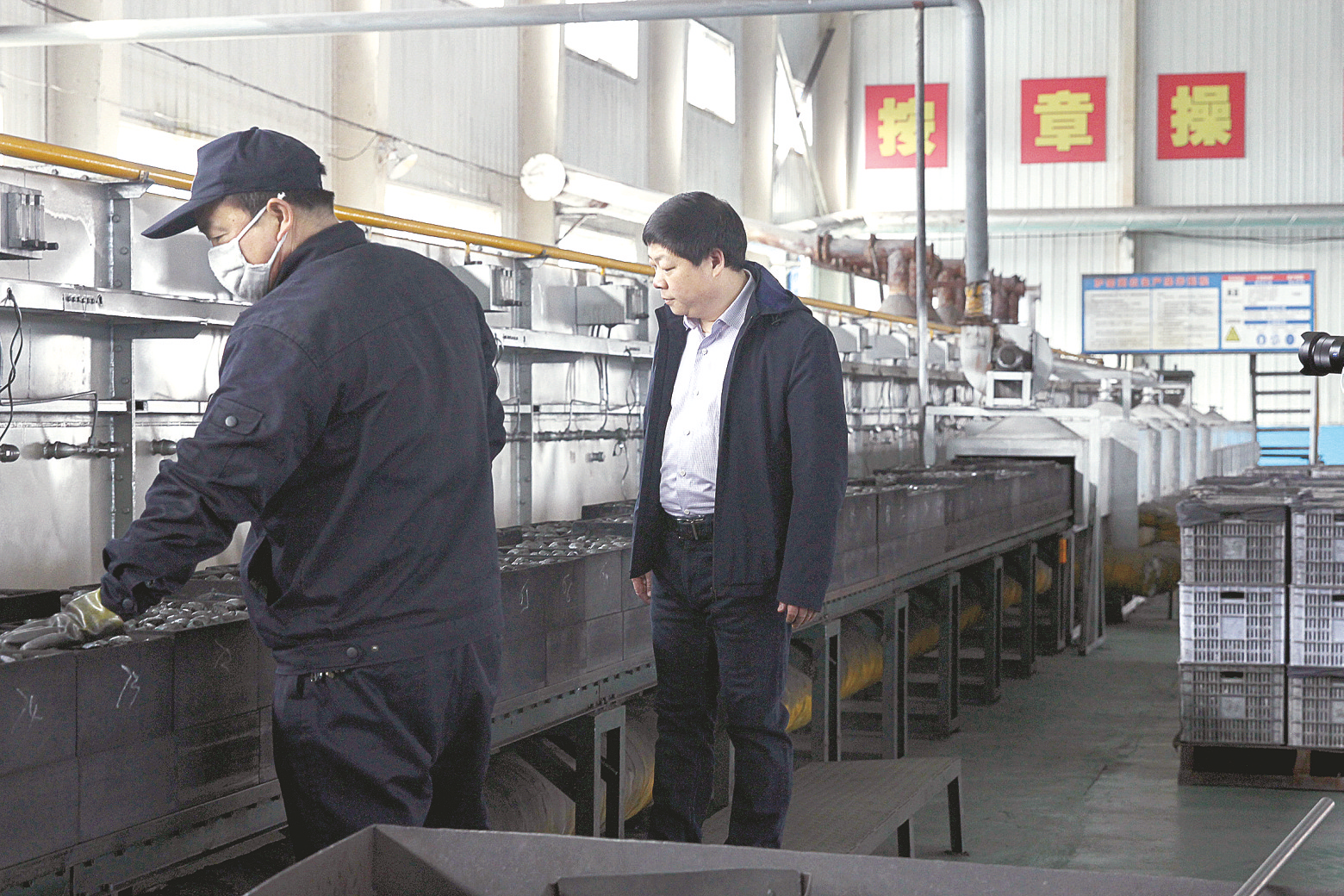 公司總經(jīng)理沈傳奇(右)在車間檢查指導(dǎo)工作