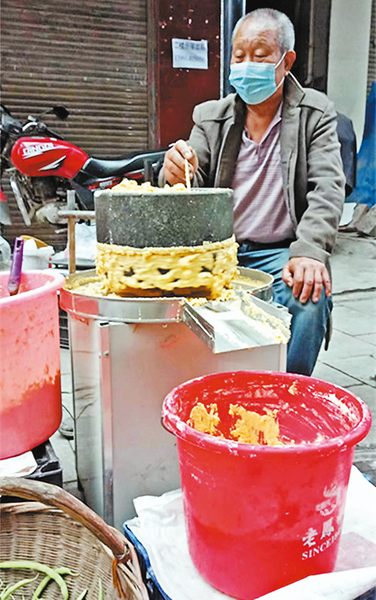 眼前這位老人的小石磨,是電動的,無須人推。老人一邊添磨子、磨漿巴,一邊應(yīng)承顧客,把磨好的漿巴賣出去,一心二用。生活用具的電動化,讓人們省力又省心。遺憾的是,沒有磨拐的小石磨,孤孤單單,像個玩具,缺少厚重感和儀式感,沒有煤油燈下一人推磨、一人添磨子,在石磨吱吱呀呀的聲音里嘮著家常的那種溫馨。