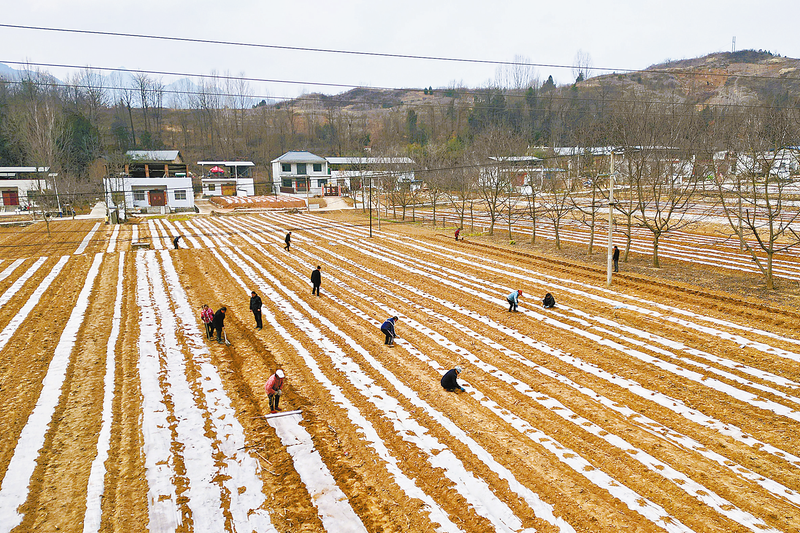 早春2月,寒意還未完全退去,山陽(yáng)縣高壩店鎮(zhèn)的田野間卻已涌動(dòng)著蓬勃的生機(jī)。2月19日,高壩店鎮(zhèn)過風(fēng)樓社區(qū)的馬鈴薯集中連片示范田里,一片熱火朝天的景象。村民彎著腰,熟練地給土坑里施肥,隨后迅速把土豆種放進(jìn)去,動(dòng)作一氣呵成,之后,給土豆種覆蓋上塑料薄膜,他們深知農(nóng)時(shí)不等人,每一分每一秒都關(guān)乎著一年的收成。