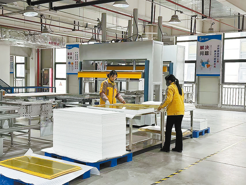 在陜西礪冰拉米拉熱能技術(shù)有限公司生產(chǎn)車(chē)間內(nèi),工人正在有條不紊地進(jìn)行金烏板與環(huán)氧板鋪膜作業(yè)。