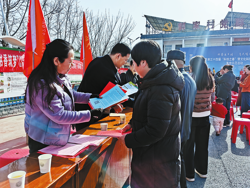 近日,山陽縣啟動第三十四屆“科技之春”宣傳月暨文化科技衛(wèi)生“三下鄉(xiāng)”集中示范活動。圖為志愿者在十里鋪街道郭家村咨詢點向群眾發(fā)放資料,普及法律、健康等方面的知識,為群眾提供義診服務(wù)和健康咨詢。(本報記者 楊若陽 攝)