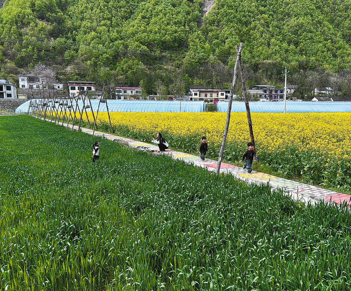 4月10日,在山陽(yáng)縣色河鋪鎮(zhèn)戀戀陸家灣景區(qū),金黃的油菜花與綠油油的連片麥田相映成景,吸引了眾多游客前來(lái)打卡游玩。 (本報(bào)記者 黃朝梅 攝)