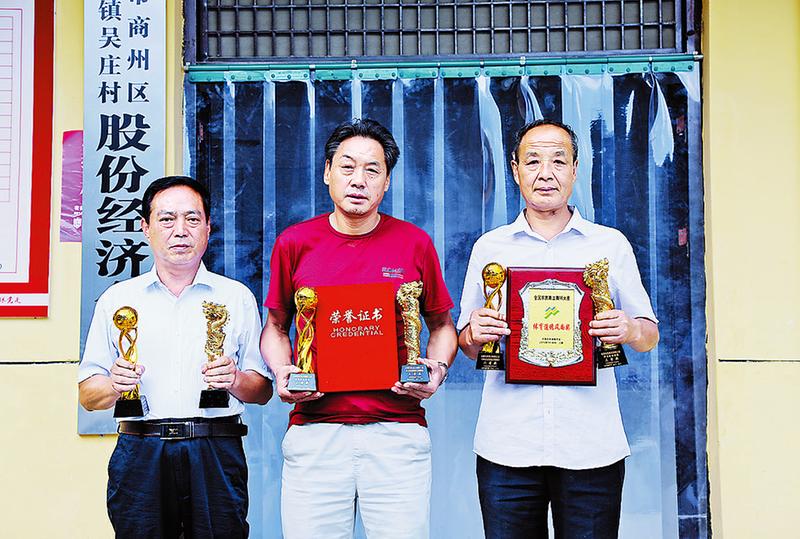 村干部展示在全國農(nóng)民舞龍舞獅大賽上獲得的獎杯和證書