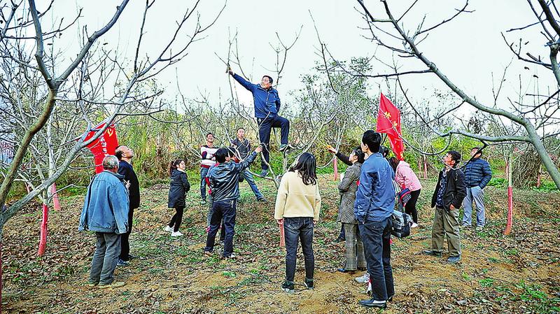 “大家看,剪前去秋梢,剪后花帶頭,這里就是春梢和秋梢的接合部,從這里剪下來(lái)以后,將來(lái)后面引芽就會(huì)長(zhǎng)得更旺,為明年增產(chǎn)打下基礎(chǔ)”。市核桃研究所所長(zhǎng)、核桃專家陳新樂(lè),一手拿著剪刀,一手攀扯著核桃樹(shù)枝,正在給村民們講解最新的核桃修剪整形技術(shù)。30多名核桃種植戶圍攏在他身邊,聚精會(huì)神地聽(tīng)他講解,看他示范。