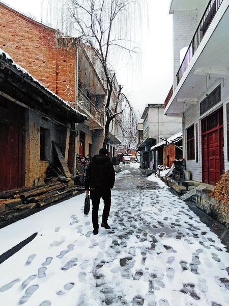 1月5日,我們?nèi)チ鲙X槽村采訪,從312國道邊的夜村鎮(zhèn)口前村找到入口,順著兩水寺溝往里走,河面漸漸變窄,兩邊的山也挨得越來越近。讓我們驚喜的是,進(jìn)了溝,我們和一場大雪不期而遇,一路被冬天的雪景深深吸引。而更讓我們感動的,是包村扶貧干部冒著大雪入戶訪貧的身影。