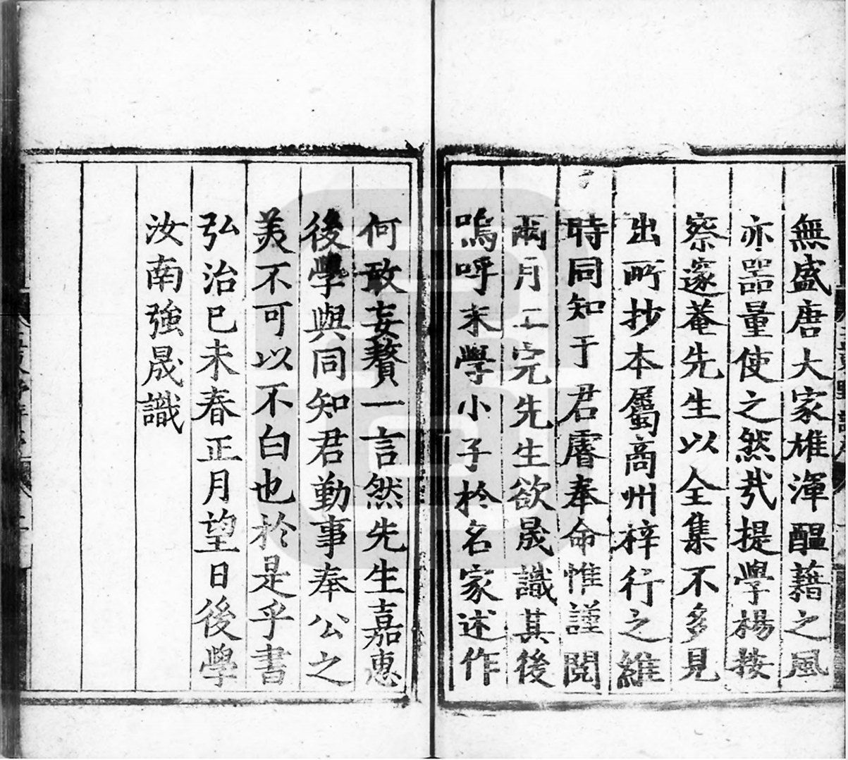 提學(xué)楊按察邃庵先生以‘全集不多見’出所抄本,屬商州梓行之。維時同知于君睿奉命惟謹(jǐn),閱兩月工完。先生欲晟識其后,嗚呼!末學(xué)小子于名家述作何敢妄贅一言?然先生嘉惠后學(xué)與同知君勤事奉公之美,不可以不白也,于是乎書。