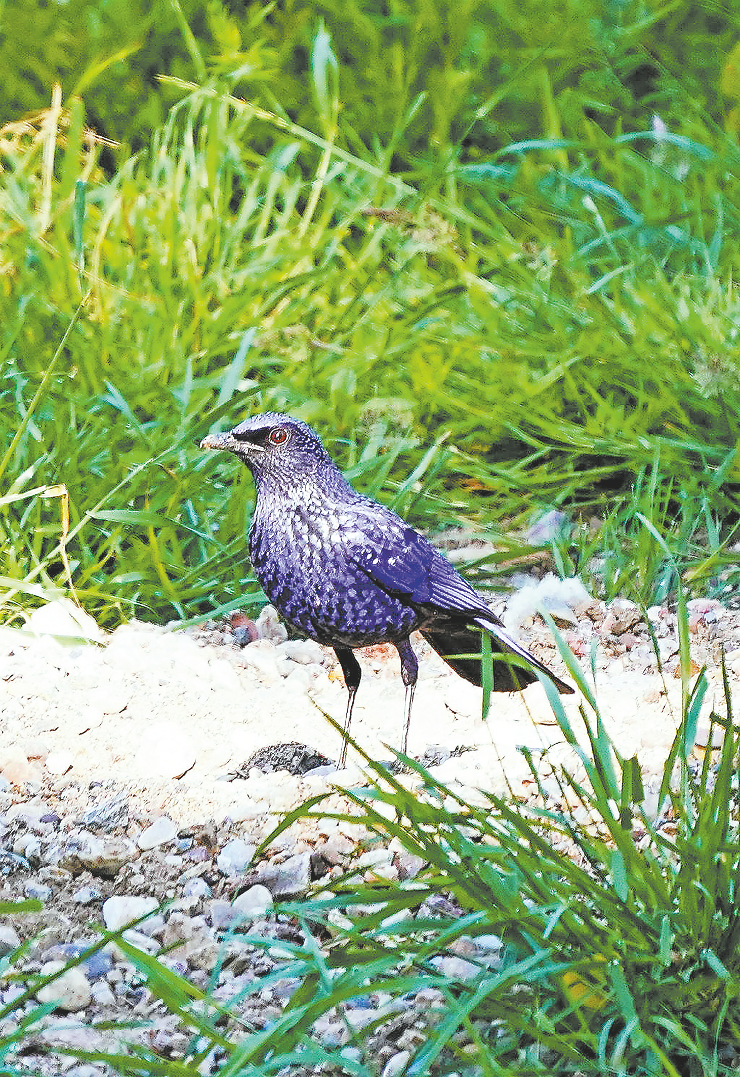 5月17日,筆者攜帶裝備,騎上摩托車趕往商州硯川河流域大荊方向,在河邊的草叢中,相繼抓拍到兩種奇特的鳥類。回家后,經過核查對比,發(fā)現拍攝的這兩類鳥在商州很少見,一種是我國的特有物種——臺灣紫嘯鶇,其胸、腹和翼的覆羽有藍色光澤,其余體羽均為紫藍色;另一種是“藍寶石”——翡翠鳥,其上體羽是藍色有光澤,下體羽是橙棕色,胸下是栗棕色,翅翼是黑褐色,足短小,腳是珊瑚紅色,尾巴很短,但飛起來很靈活。