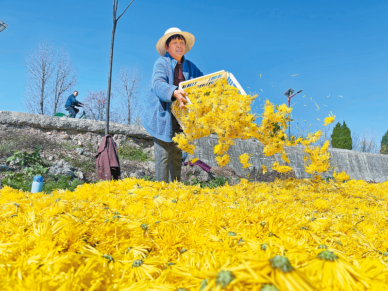 秋菊有佳色,裛露掇其英。11月15日,走進(jìn)商州區(qū)腰市鎮(zhèn)泉村的盛世興農(nóng)種植示范基地,黃色、白色的菊花競相綻放,形成一片花海,香氣撲鼻,令人陶醉。村民井然有序地采摘、晾曬菊花,一派繁忙景象。