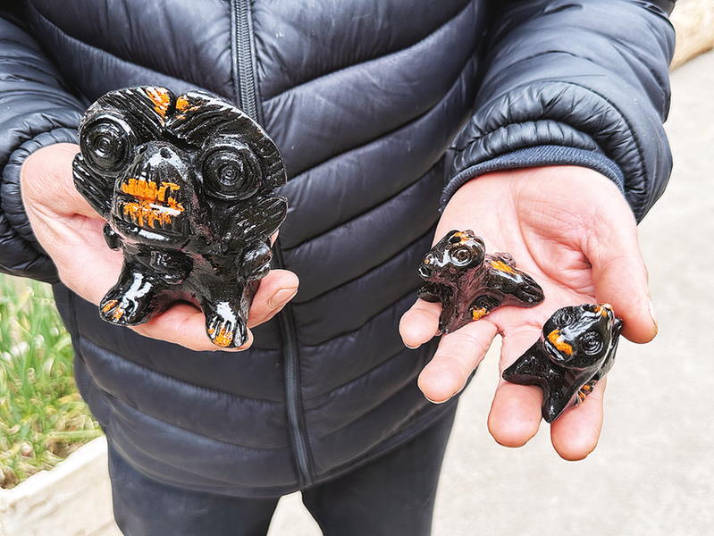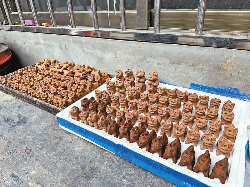 這還只是初步的過程,捏狗娃咪很快,陳五斤捏一個中等大小的狗娃咪成坯大概用時在兩分鐘。捏制好的成坯還要放在小院兒里晾曬,待干后置于廚房的灶膛中,用燒飯時的火候燒制半個多小時后取出,待溫度適中時,以松香涂其身,則顯通體烏黑錚亮,再以黃膽紅點綴,整個制作便完成了。“燒制過程比較考驗技術(shù),要掌握火候,不然容易炸開。”陳五斤介紹。
