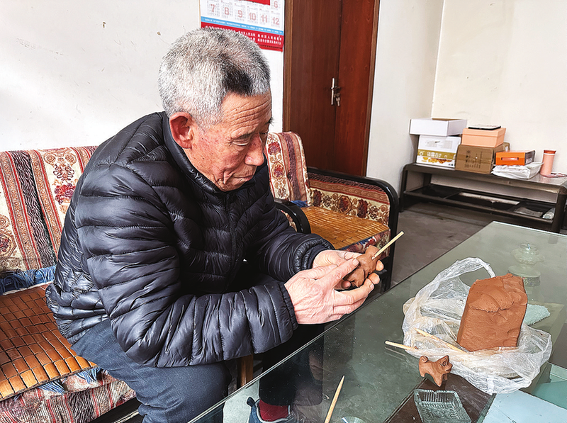 “這些就是兒童玩具。過去沒有啥耍的,娃們都稀罕這個。”陳五斤回到屋里坐下來,揪下來一塊紅膠泥,邊捏邊說,“我媽以前老捏呢,捏了一輩子,閑了就捏,到了晚上點上燈捏,她愛捏這個,捏得最好。”