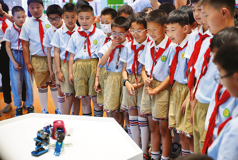 5月15日,在商州區(qū)科普館,孩子們高興地和機(jī)器人互動。