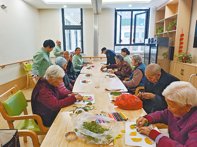 在金菊養(yǎng)老中心,護(hù)理人員和老人共同開展手工制作活動(dòng)。