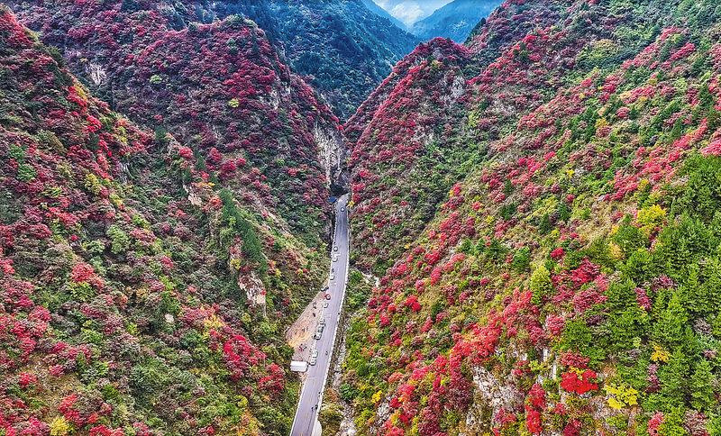 金秋時(shí)節(jié),秦嶺紅葉即將進(jìn)入最佳觀賞期。十月十五日,位于312國(guó)道商州區(qū)牧護(hù)關(guān)鎮(zhèn)峽口段的山間正悄然披上斑斕彩衣,紅葉似火的秋日美景吸引了大批游客驅(qū)車前往觀賞。 (本報(bào)記者 楊 鑫 攝)