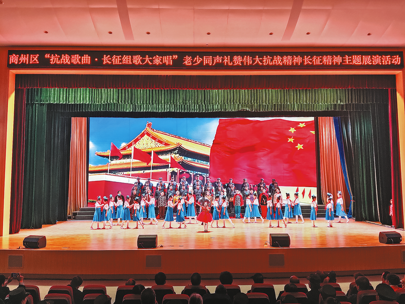 10月26日,商州區(qū)“抗戰(zhàn)歌曲·長(zhǎng)征組歌大家唱”主題展演活動(dòng)在商州區(qū)高級(jí)中學(xué)舉行?;顒?dòng)現(xiàn)場(chǎng),老少群眾同臺(tái)高歌,以激昂的紅色經(jīng)典歌曲謳歌偉大抗戰(zhàn)精神和長(zhǎng)征精神,傳承紅色基因,凝聚奮進(jìn)力量。 (本報(bào)記者 馬澤平 攝)