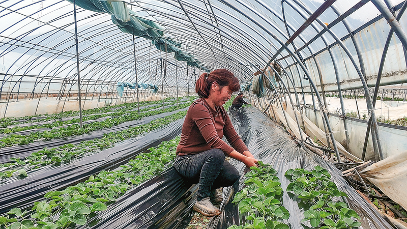 近期正是草莓苗栽種季,村民忙著在大棚里為草莓苗覆保溫膜。