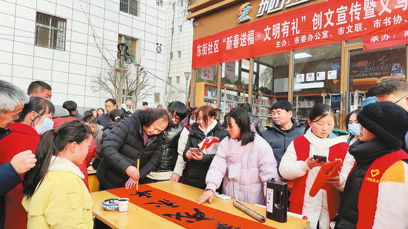 1月31日,商州區(qū)城關(guān)街道東街社區(qū)“新春送福,文明有禮”創(chuàng)文宣傳暨義寫春聯(lián)活動(dòng)在區(qū)圖書館舉行,市區(qū)十幾名書法家現(xiàn)場(chǎng)揮毫潑墨,為群眾義務(wù)書寫春聯(lián)460多副,為馬年春節(jié)營(yíng)造濃濃的新春文化氛圍。 (本報(bào)記者 賈書章 攝)