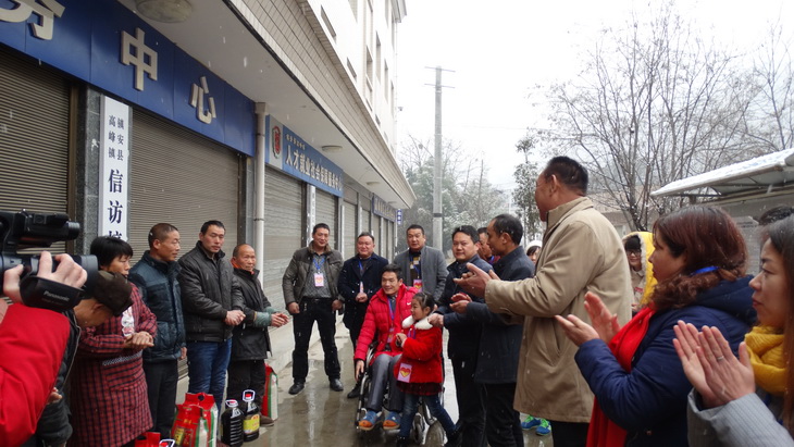 1月31日,深冬的一場(chǎng)雪鋪滿大地,料峭寒風(fēng)中,“愛心大使”馬華帶領(lǐng)愛心人士和志愿者們?cè)谘┗h飄的周末來到高峰鎮(zhèn),為各村的貧困戶們送來了春節(jié)的慰問品。