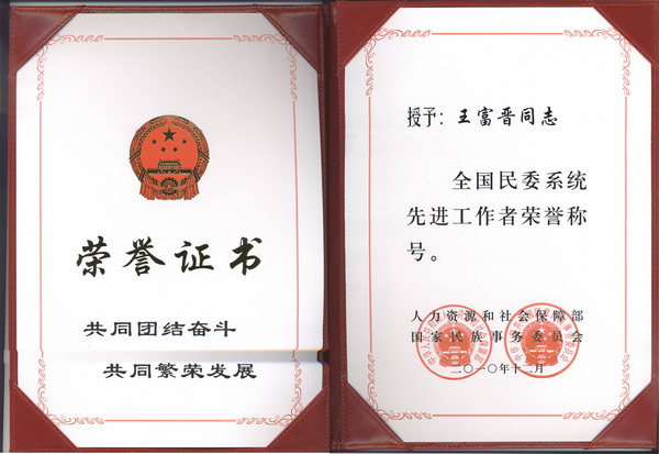 國家人社部和民委共同授予王富晉同志全國民委系統(tǒng)先進(jìn)工作者榮譽稱號