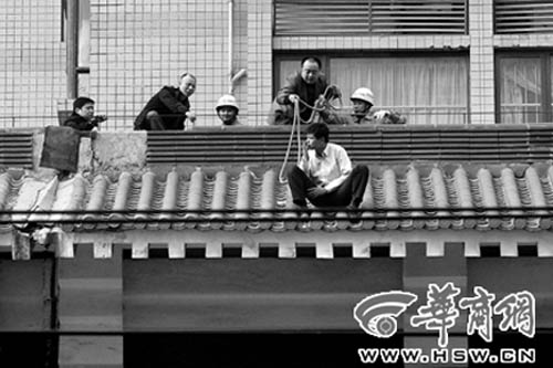 昨日下午3時許,記者趕到現(xiàn)場時,樓下已經(jīng)聚集了幾百名市民。一名20多歲的男子坐在5樓平臺的斜坡上,一只腳伸在外面晃悠,不停地用手機打著電話,一會哭一會笑。