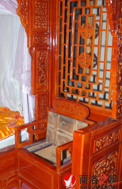 這張古床看上去就像一間棕褐色的閨房,整個(gè)床架高2.8米,長、寬均為2.2米,飄檐、睡鋪、床壁、床頂完整無損。里面的床鋪約1.5米寬,外面留有一米寬的小廳,放下床紗簾自然將里外隔開。小廳里有兩張同色的雕花椅子,相向而放。椅子是古時(shí)的箱式太師椅,坐板上有拉繩,拉開拉繩,下面是箱子,可以擱放鞋物及主人私人用品。外面小廳開有花窗,廳內(nèi)可供主人聊天喝茶、做針線。