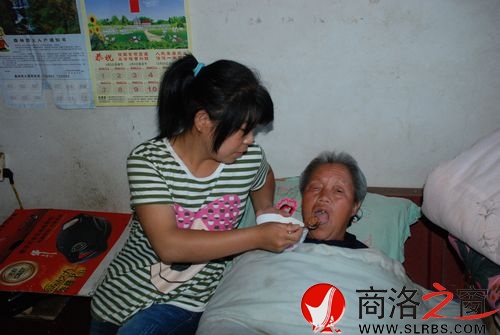 6月22日下午,天下著小雨,筆者來到了位于洛南縣永豐鎮(zhèn)楊村一組的張妮家。我們看到祖孫二人住在一座有些陳舊的三間土房內,院落雖然有些破舊,屋內也沒有一件像樣的家具,但卻打掃的干干凈凈,室內物品也擺放的井井有條,鍋臺簡單潔凈。在東側一間光線有點昏暗的房間土炕上,我們看到,張妮正側坐在土炕邊沿給臥病在床的奶奶霍琴娃一勺一勺地喂著米粥,還不時地用毛巾幫奶奶擦著嘴角。