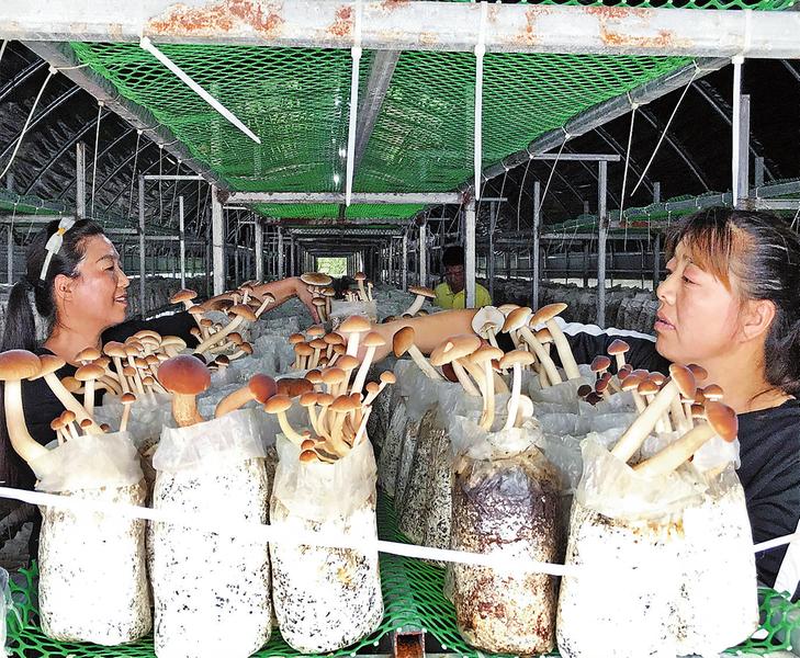 村民在食用菌大棚里采摘茶樹菇