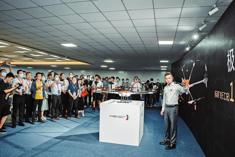 2021年,徐祥勇在中天禹辰特種無人機(jī)全球首發(fā)儀式上介紹產(chǎn)品情況。