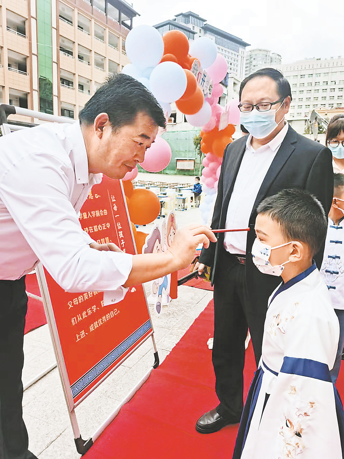 日前,鎮(zhèn)安縣第三小學(xué)舉行了2022屆一年級(jí)新生入學(xué)禮活動(dòng)。當(dāng)日,400多名孩子在家長(zhǎng)的帶領(lǐng)下有序排成隊(duì)伍,走進(jìn)校園走紅毯,經(jīng)過(guò)正衣冠、點(diǎn)朱砂、寫人字、按手印四項(xiàng)禮儀后進(jìn)入智慧門,家長(zhǎng)將孩子的手交到老師手中,并向老師行拜師禮,老師一一點(diǎn)頭回禮。通過(guò)入學(xué)禮活動(dòng),為孩子們上了一堂生動(dòng)的啟蒙課,也為孩子們健康成長(zhǎng)、勤奮學(xué)習(xí)奠定了堅(jiān)實(shí)基礎(chǔ)。 (本報(bào)通訊員 朱 順 攝)